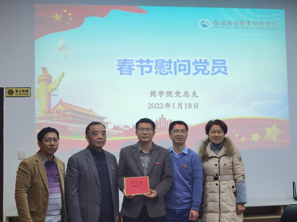 为贯彻落实《中共福建省委教育工委办公室关于在元旦春节期间开展走访慰问生活困难党员、老党员、老干部活动的通知》(闽委教办组〔2021〕4号)要求,使广大党员、干部和群众深切感受到以习近平同志为核心的党中央的关怀和温暖,2022年1月18日药学院党总支在会议室组织开展春节慰问党员活动。校纪委书记游锋、药学院领导班子莅临现场。