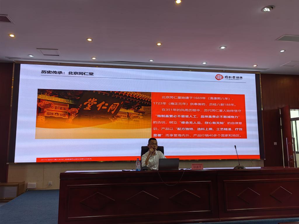 钟盛芳总监围绕中药行业常见岗位、职业素养以及同仁堂的企业文化三方面进行深入阐述。开篇讲述《“十四五”中医药发展规划》,指出中医药行业在未来五年将以习近平新时代中国特色社会主义思想为指导,持续提升中医药服务人民健康能力,中医药行业政策利好,市场空间将得到快速释放,同时指出企业发展更需要注重可持续性,需要匠心经营。钟总监结合自身近20年丰富的从业经验介绍了中药行业特点及发展前景,通过数据和案例介绍中药行业常见岗位和企业用人要求,对学生未来的学习和职业规划提出了建议:希望同学们能踏实认真学习,在学好专业知识和技能的基础上,积极参加企业实践,充实自己的校园生活,提高专业技能,为未来的职业做好准备。此外,钟总监致力于弘扬劳模精神和工匠精神,强调历代同仁堂人始终恪守“炮制虽繁必不敢省人工,品味虽贵必不敢减物力”的古训,树立“修合无人见,存心有天知”的自律意识,产品以“配方独特、选料上乘、工艺精湛、疗效显著”为准则。希望同学们能时刻牢记作为一名药者的初心和使命。