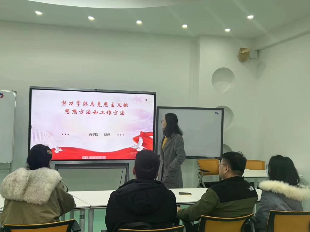 12月20日,药学院学生第二党支部书记胡丹以“努力掌握马克思主义思想方法和工作方法”为专题为支部党员上党课。党课以坚持实事求是、坚持战略定力、坚持问题导向、坚持全面协调、坚持底线思维、坚持调查研究、坚持抓铁有痕、坚持历史担当等八个方面展开。胡丹强调,作为高校教师党员,在学习工作中我们要坚持“只有解放思想才能实事求是,只有实事求是才是解放思想”;要有“纷繁世事多元应,击鼓催征稳驭舟”的教学科研定力;在处理繁杂的工作上要学会抓大放小、以大兼小,以小带大、小中见大,做好工作统筹;在学生管理工作中要首先深入开展调查研究;在支持学校建设上要有“功成不必在我,功成必定有我”的奉献精神。