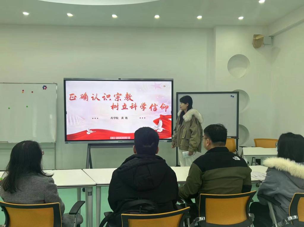 12月19日,药学院学生第二党支部党员、药学院副院长黄艳为支部党员主讲“正确认识宗教 树立科学信仰”专题党课。课上详细讲解了宗教的性质及起源、马克思主义宗教观、我国的基本宗教政策等内容,最后引出“我们应如何正确对待宗教”。黄艳指出,我国是一个多民族国家,宗教更多的是与民族信仰和民族感情联系在一起,要尊重一个民族,就要尊重他们的民族信仰。我们当代应该坚定马克思主义信仰,认真学习和运用辩证唯物主义和历史唯物主义,不怕鬼,不信邪,注意客观地、全面地、发展地认识事物,树立科学精神,遇事先用科学理论、科学的知识去分析、去判断、去验证。
