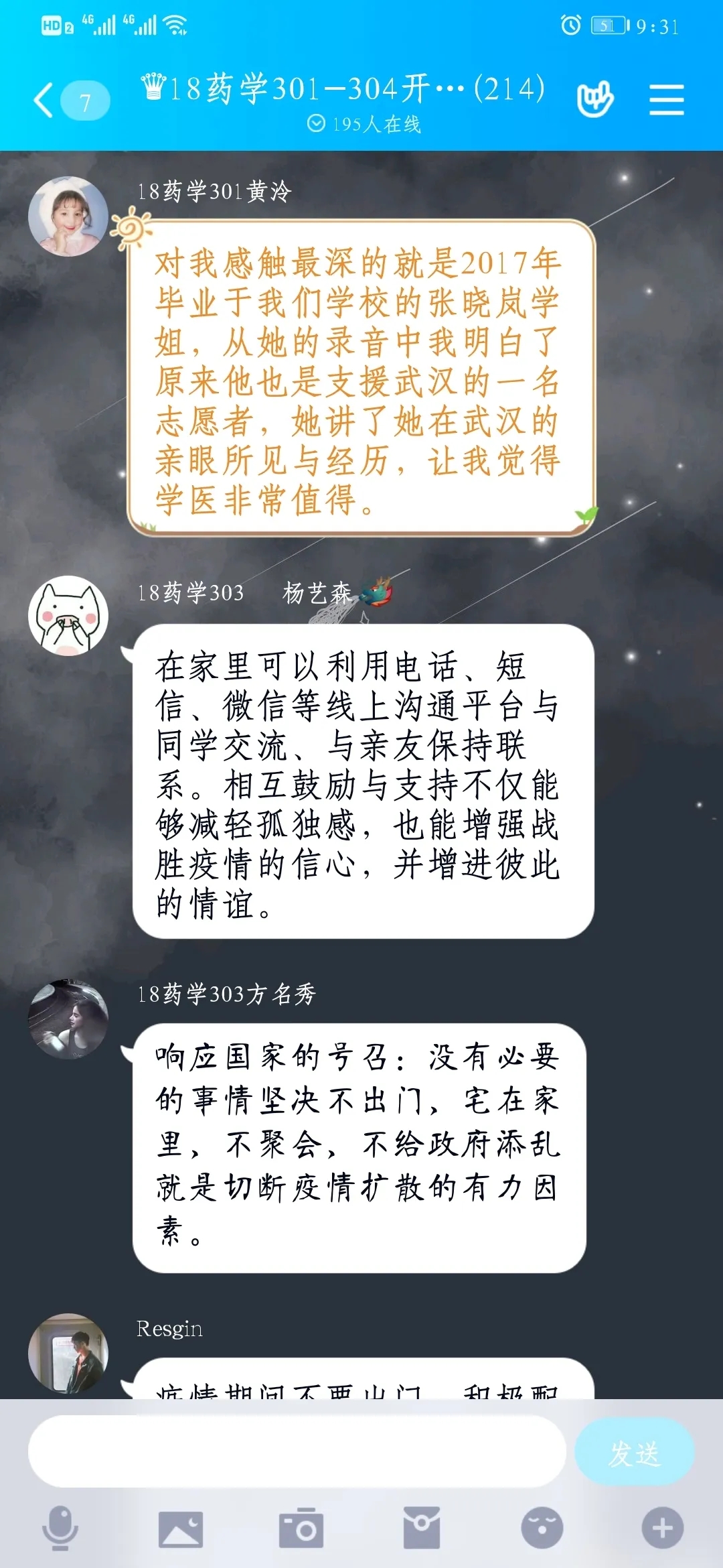 17药学301班杨庆玲同学说:这封回信既是对医学生的鼓励,也是对逆行奋战在抗疫前线、救死扶伤的广大医护工作者的鼓舞与肯定,而作为同样在外实习的我而言,在疫情当前,虽不能“逆行奋战”在抗疫前线,但是我仍时时刻刻关注着疫情。我会好好学习,把所学用到实处,理论联系实际,用实际行动做一位党和人民都信赖的医护工作者。18药学306班林栎同学说:在这封回信中习近平总书记高度肯定了医生是人民健康的守护者,高度赞扬了医生用行动诠释了白衣天使救死扶伤的崇高精神!这群兢兢业业、无私奉献的医学生志愿者,用实际行动生动地诠释了当代青年学子的作为与担当,他们不怕苦累、不惧疫情,用专业和敬业,用信念和执着,真切地展示了团员青年的时代风采,我们应当向他们学习。