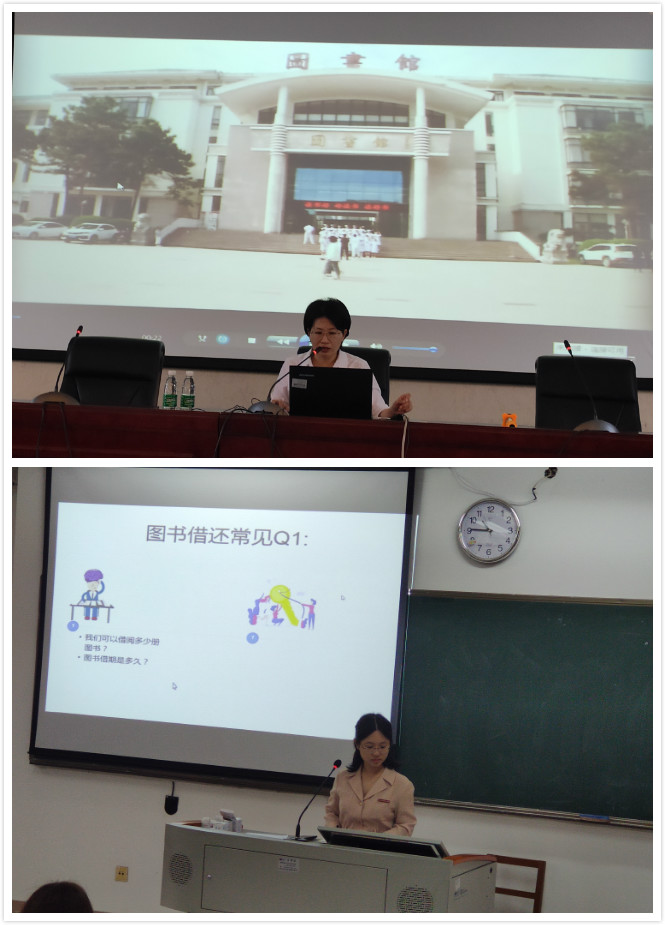 刘颖、林玲向同学们讲解了图书馆的纸质、电子馆藏情况;书刊借还流程;阅览基本规则,并希望同学们以书为伴、汲取营养、内化于心。