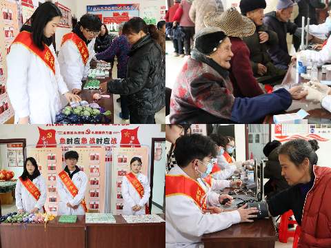 义诊分队的队员在村部,为村民免费测量血糖、血压,耐心地为村民解答健康问题,向村民普及常见疾病的预防和日常保健知识。