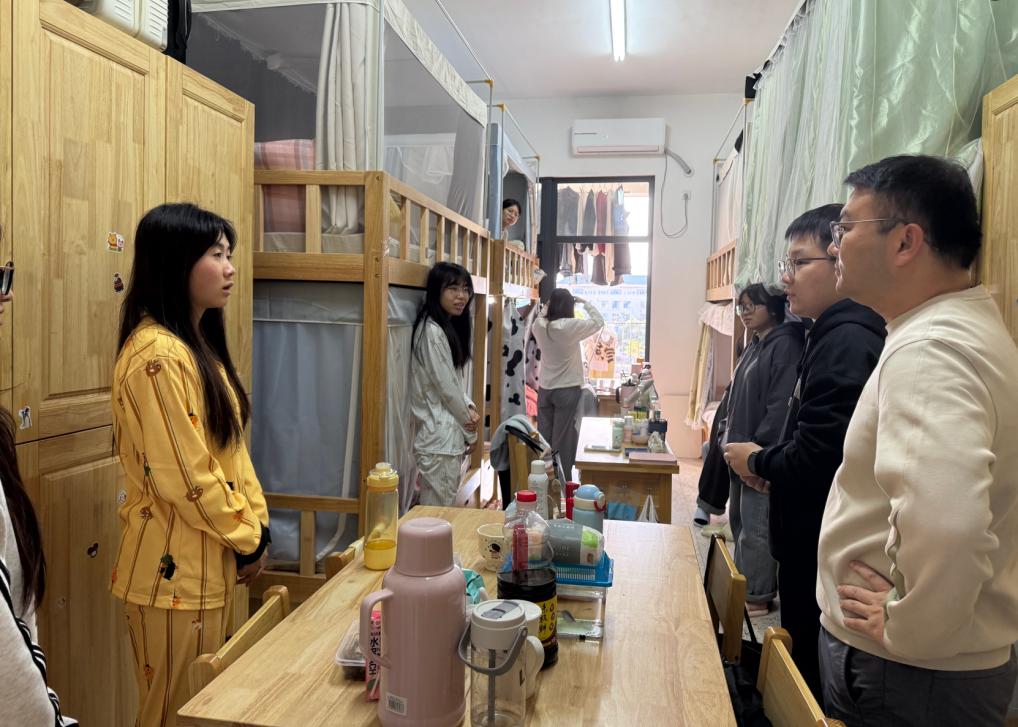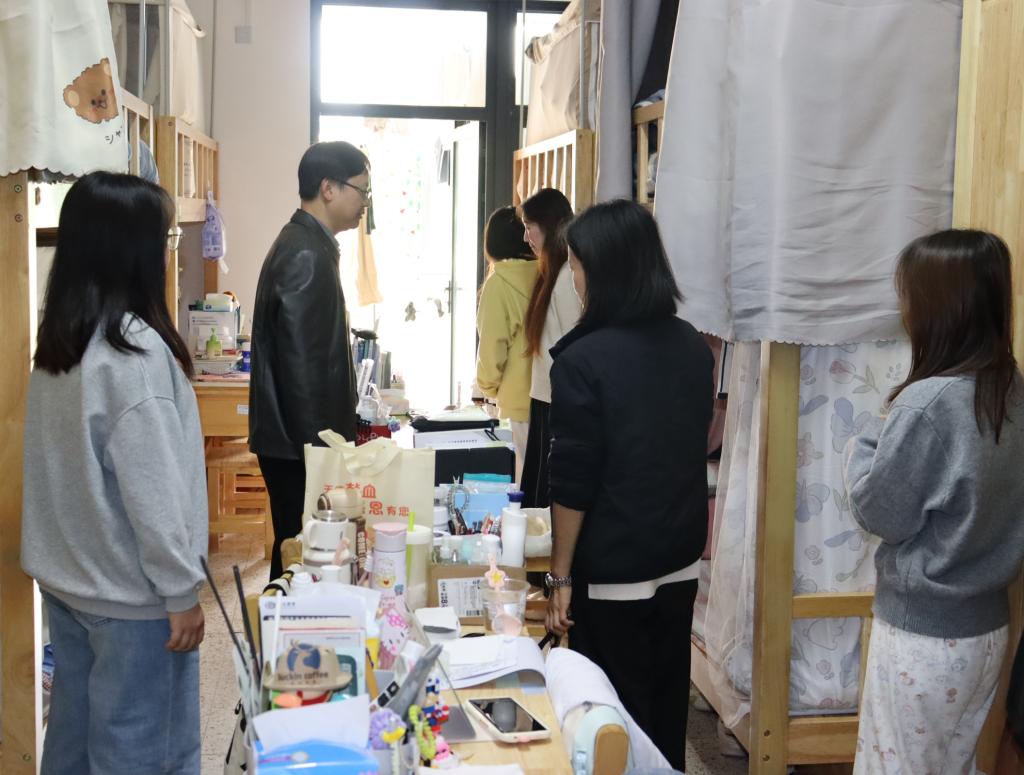 “最近气温变化大,要注意添衣保暖,宿舍常通风。”每走进一间宿舍,学院领导都亲切询问同学们的日常生活与学习情况。检查小组重点关注用电安全,对违规电器进行排查,同时向同学们普及安全知识。