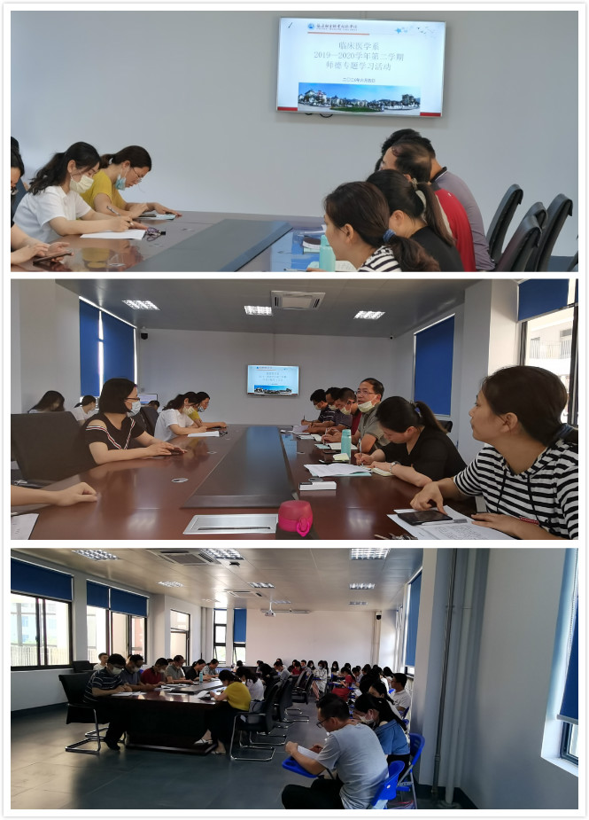 2020年6月4日下午,临床医学系全体教职工集中实训楼310,学习《关于加强和改进新时代师德师风建设的意见》及《新时代高等学校思想政治理论课教师队伍建设规定》。