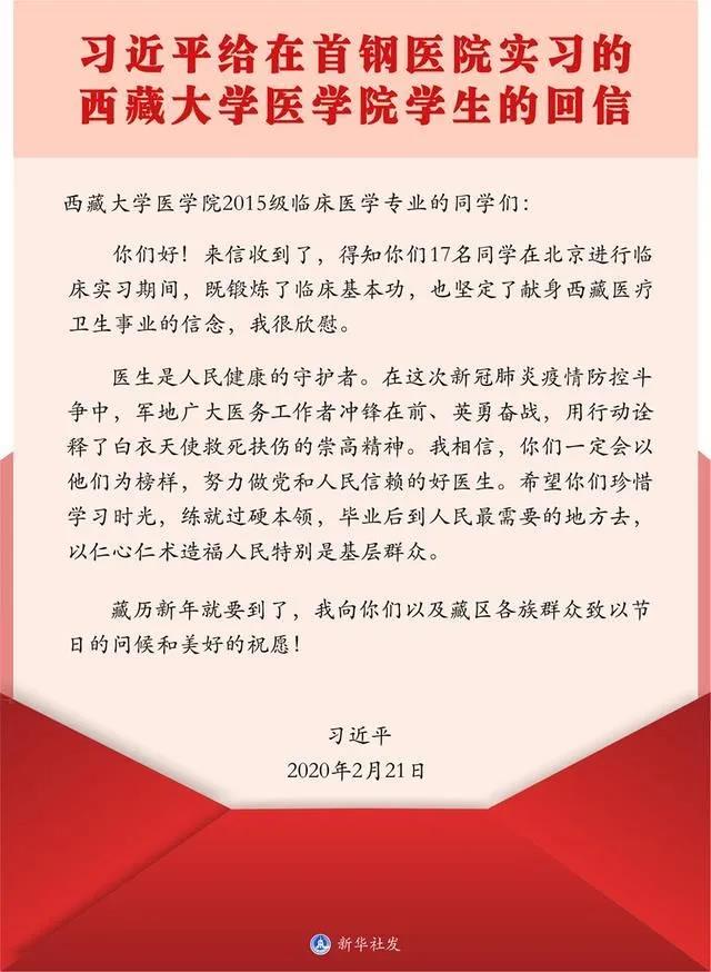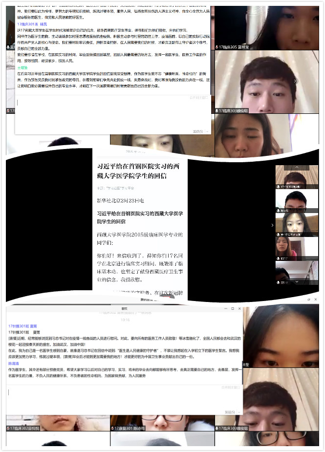 2月21日,习近平总书记给正在北京大学首钢医院实习的西藏大学医学院学生回信,肯定他们献身西藏医疗卫生事业的志向,勉励他们练就过硬本领、服务基层人民,并向他们以及藏区各族群众致以节日的问候和美好的祝愿。随后引起我系师生的热议,2月24日上午,在我系团总支书记陈清清、副书记谢林辉主持下,组织开展了线上学习会议,18级团学干部、17级实习生代表共同参加了学习;25日晚上,我系团总支组织各团支部召开线上主题团日活动。