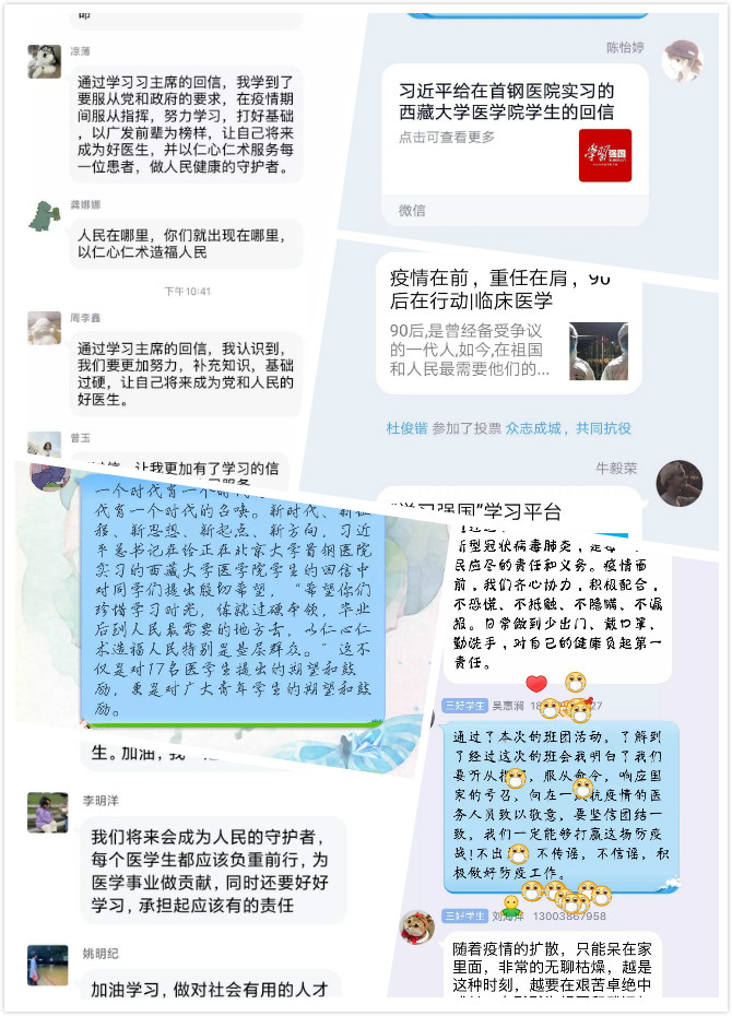 同学们纷纷表示要牢记习近平总书记嘱托,认真学习医学专业知识,练就过硬本领,以奋战在新冠肺炎疫情防控斗争中的医务工作者为榜样,听党指挥,尽早投身祖国的医疗卫生事业中,做党和人民信赖的好医生。