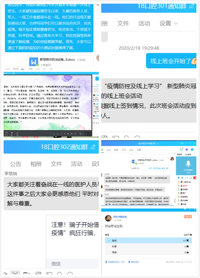 开学的第一周,根据学校的安排,临床系组织学生开展“停课不停学”的线上教学活动,同时辅导员们也积极组织各班学生开展了“防疫”班会。做“守护者”,担使命、保安康。教育引导学生要时刻与祖国站一起,团结一心,抗击疫情,不信谣不传谣,不漏报、不瞒报个人情况,重申卫生防护的重要性。做“识途者”,要做到游必有方。告知学生以大局为重,珍视自己和他人的生命,务必按照学校统一部署,配合学校返校复学工作的相关安排,做好个人防护和返程规划,取得此次防“疫”的最终胜利。做“修行者”,宅其身、抱道行。作为学生,首要任务就是学习,居家不荒废时间,抓住时机努力学习,积极、认真参加学校的网络教学。停课不停学,争做知识学习“追梦人”。同时大家结合近日发生的不法分子借疫情网络授课流行之际行诈骗的案例提醒同学们要提高警惕,不要掉以轻心,落入陷阱。