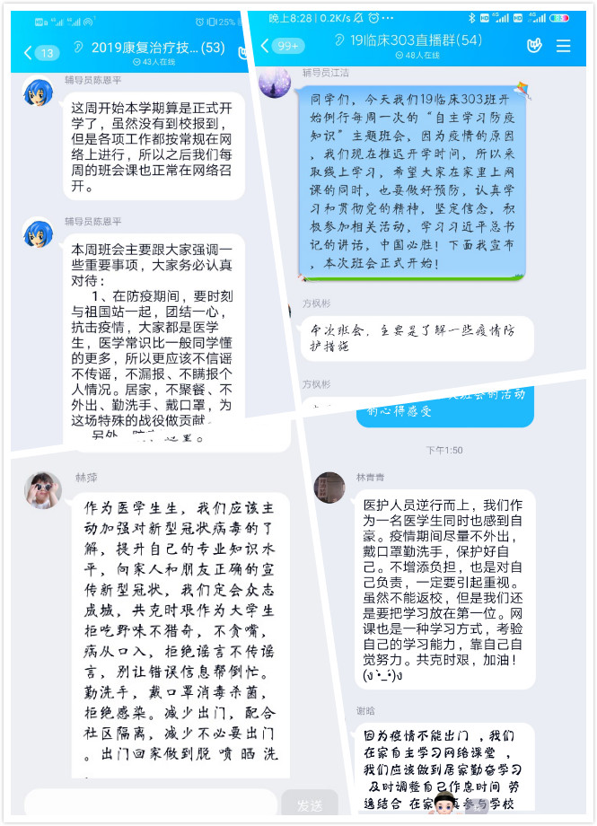 在这个特殊时期,临床系的辅导员们利用各种直播平台在线开展了此次班会,形式新颖、效果良好、收获颇丰。让学生深入了解疫情的同时,加强爱国主义教育,让学生们认识到作为新时代青年在这场战“疫”中的使命与担当。