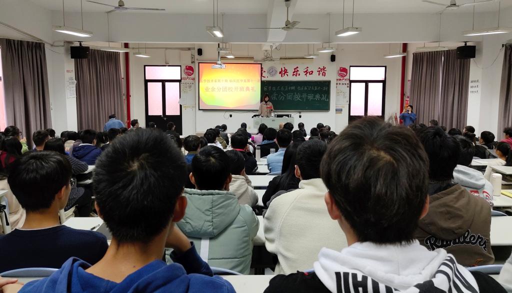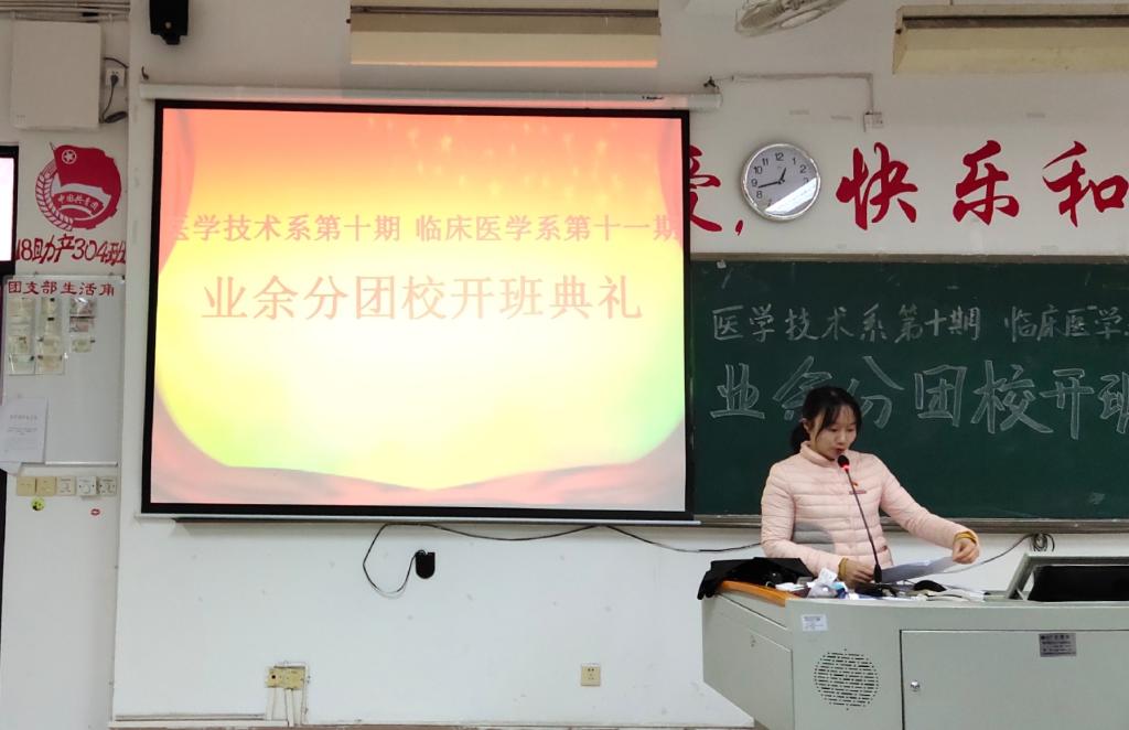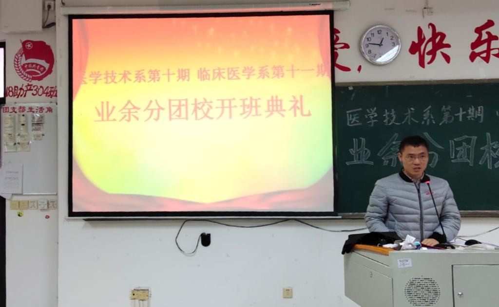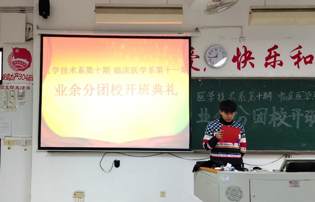 为提高团组织的凝聚力和战斗力,做好我系学生团员的发展工作。临床医学系第十一期业余分团校于12月20日中午在教学楼210举行开班仪式。我系党总支负责人陈俊颖副书记、陈洁副书记、医学技术系党总支负责人邱滚忠副书记、两系团总支书记、副书记和辅导员老师们,以及两系各委员及业余分团校的所有学员共同出席、参加了开班仪式。