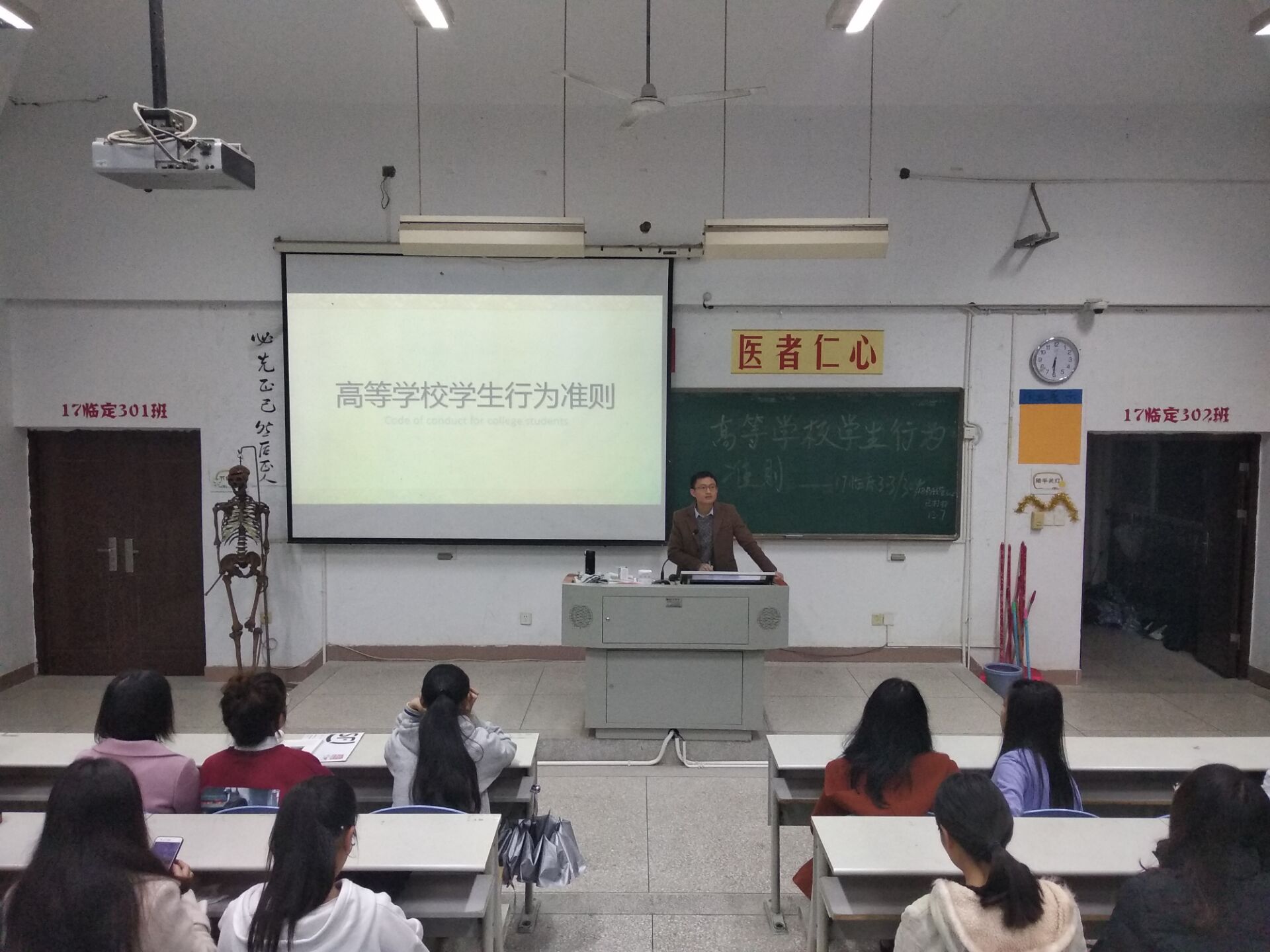 为更好地规范学生的日常行为,培养学生良好的学习习惯、生活习惯、行为习惯,形成良好的校纪校风和班风,临床医学系于2018年12月9日晚组织各班级开展学习《高等学校学生行为准则》主题班会。