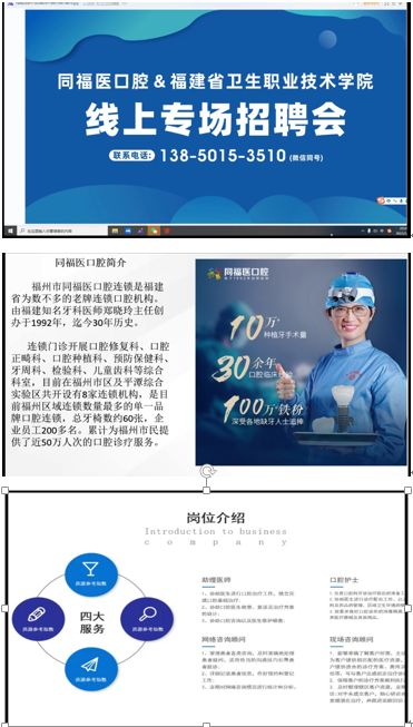 5月24日晚,我院口腔医学专业通过线上平台召开2019级第二场的职业宣讲会。参加此次会议的有福州同福医口腔连锁人力资源负责人谢总监、福州同福医口腔总监助理;口腔专业带头人马清璇、口腔教研室教师张兰隽、2019级口腔专业辅导员黄惠龙以及2019级全体学生。本次会议由马清璇主持。