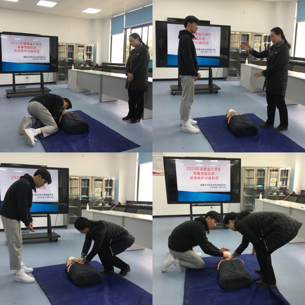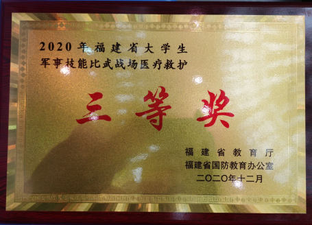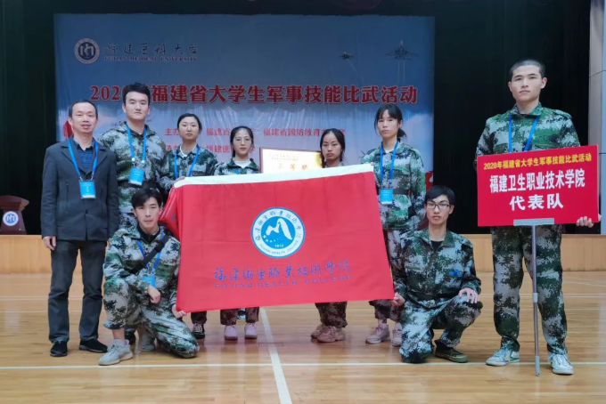 12月25日-27日由福建省教育厅、福建省国防教育办公室主办,福建医科大学承办的2020年福建省大学生军事技能比武竞赛在福建医科大学举行。由医学系8名学生组成的福建卫生职业技术学院代表队参加了战场医疗救护和手榴弹定点投掷两个项目,并获得“2020年福建省大学生军事技能比武战场医疗救护”三等奖。