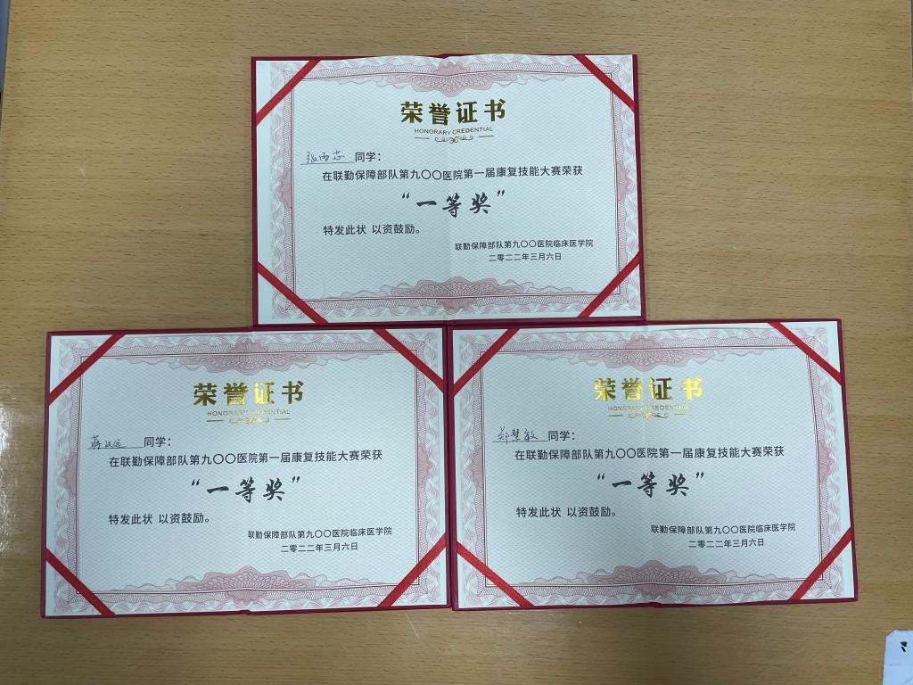 2022年3月6日,联勤保障部队第九〇〇医院第一届康复技能大赛圆满结束,我院19级康复治疗技术专业张雨芯、郑慧敏、蒋致远3名学生荣获团体一等奖。