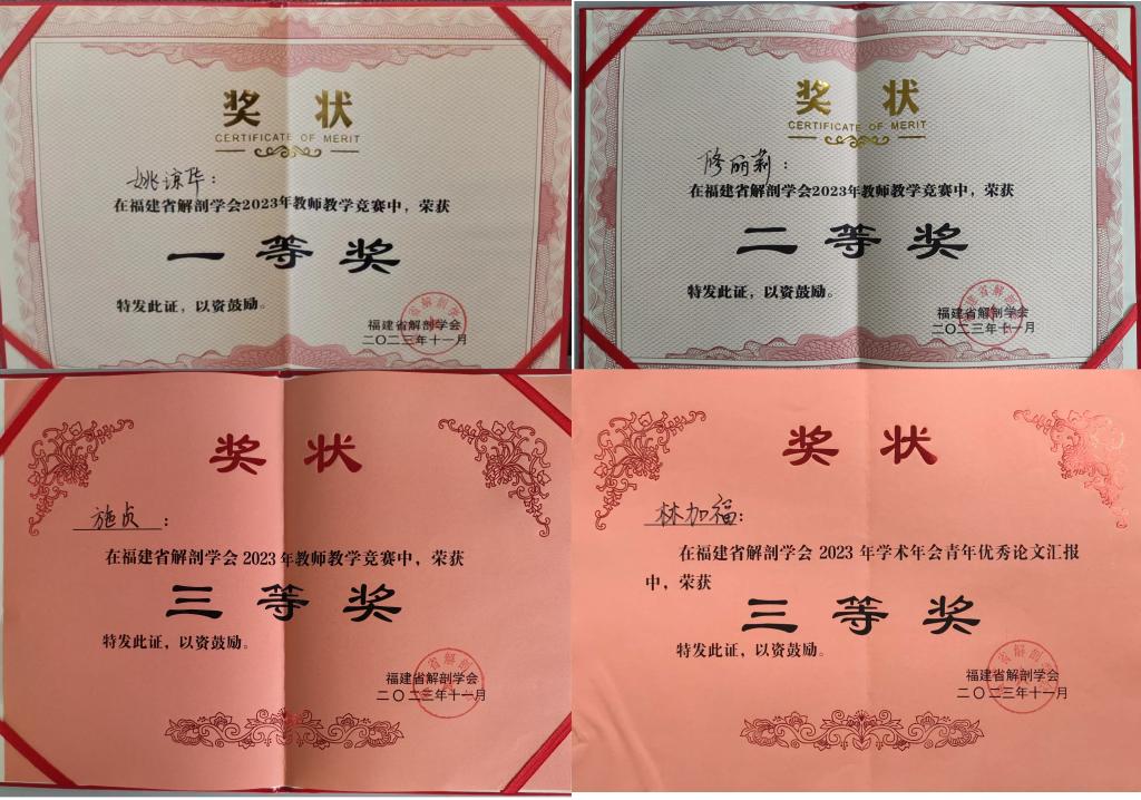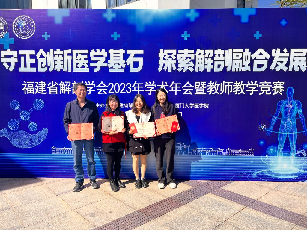 在教师教学竞赛中,来自省内近20所医药卫生类院校的优秀解剖学教师同台竞技,展现了各自的授课风采。我校医学院解剖学教研室姚琼华、修丽莉、施贞三位教师以稳健的台风和精彩的授课内容,分别荣获福建省解剖学会2023年教师教学竞赛第一名、第二名和第四名。