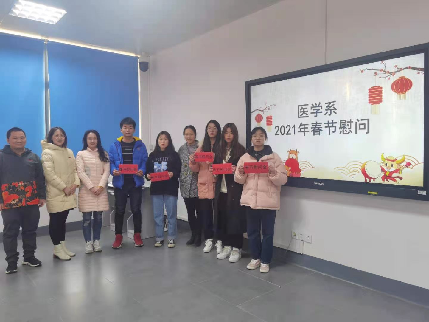 佳节将至,岁寒情深,为了让孩子们感受来自学校、系部的深切关爱,度过一个温馨祥和的春节,医学系于2021年1月12日下午在实训楼311开展2021年春节慰问活动。医学系党总支副书记陈洁、20级慰问学生代表及辅导员一同参加了活动。