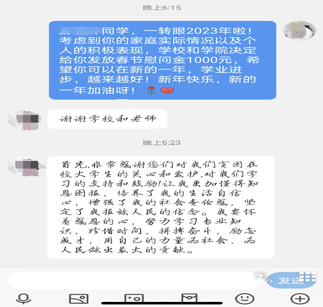 岁寒情深,为把党和国家对家庭经济困难学生的关怀落到实处,2022年12月29号,医学院领导、全体辅导员通过线上、线下开展“迎新春,送温暖”活动,为学生送上亲切的关怀和慰问金,同时就学生的家庭生活、学习等方面与同学们暖心交流。