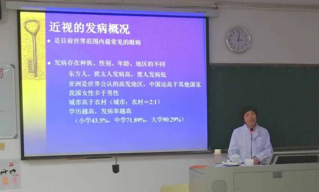 胡艳红教授通过全球青少年近视的具体数据作为切入点,对有关于近视的“分类、疾病、预防、治疗”四个方面进行详细分析。同时还向同学们传授如何分辨真假近视和有效避免近视程度加深的方法,重点提醒了关于高度近视的危害与治疗方法。胡教授用通俗易懂的语言给同学们带来有关于近视方面的深度知识与治疗方法。她利用数据,联系实际,以医为学博得了同学们的热烈掌声。
