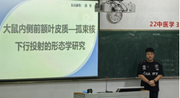 活动中,解剖教研室主任陈英标老师就今年指导的项目《大鼠内侧前额叶皮质——孤束核下行投射的形态学研究》做总结分享,他指出参赛同学在备赛过程要多参与实验操作、掌握实验的每个环节涉及的理论知识,同时团队比赛非常考验合作能力,组员之间多交流、积极参与每次的组会交流,培养团队默契,才能在比赛答辩环节取得更好的成绩。