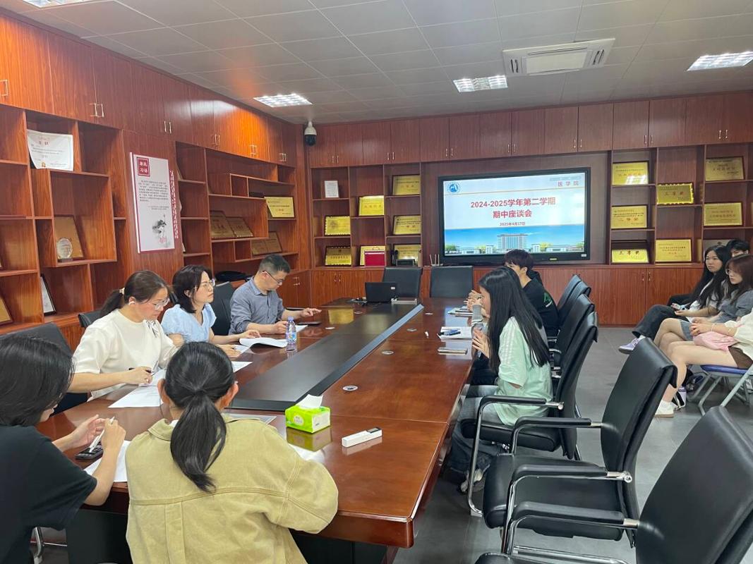 医学院于2025年4月18日在笃行楼311会议室召开期中座谈会。学校质量管理办公室副主任李燕平,医学院院长邓元荣、副院长刘能英以及各班学习委员参加此次会议。