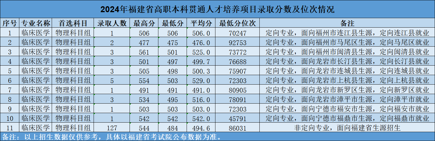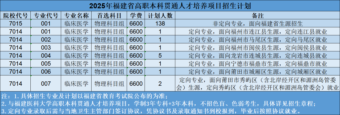 学校与福建医科大学合作共同培养“3+3”高职本科贯通临床医学(全科医学方向)应用型本科人才,培养适应福建省基层医疗机构需求的本科层次实用型全科医学人才和医疗卫生技术人才。