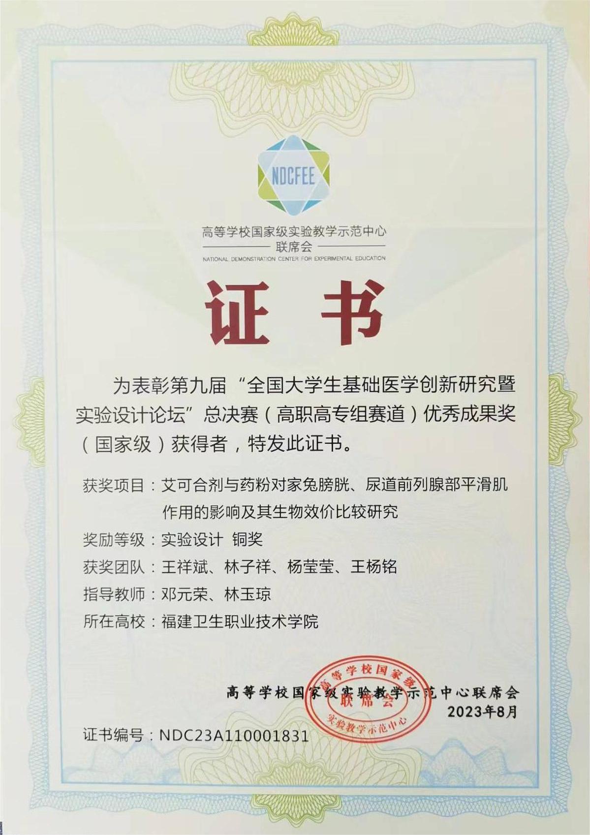 近年来,学生荣获全国大学生医学创新比赛省级一等奖3项、二等奖3项、国家级银奖2项、铜奖2项,职业技能竞赛省级一等奖2项、二等奖3项、三等奖2项,在全国职业院校临床医学专业技能大赛和福建省大学生军事技能比武中荣获奖项多次。