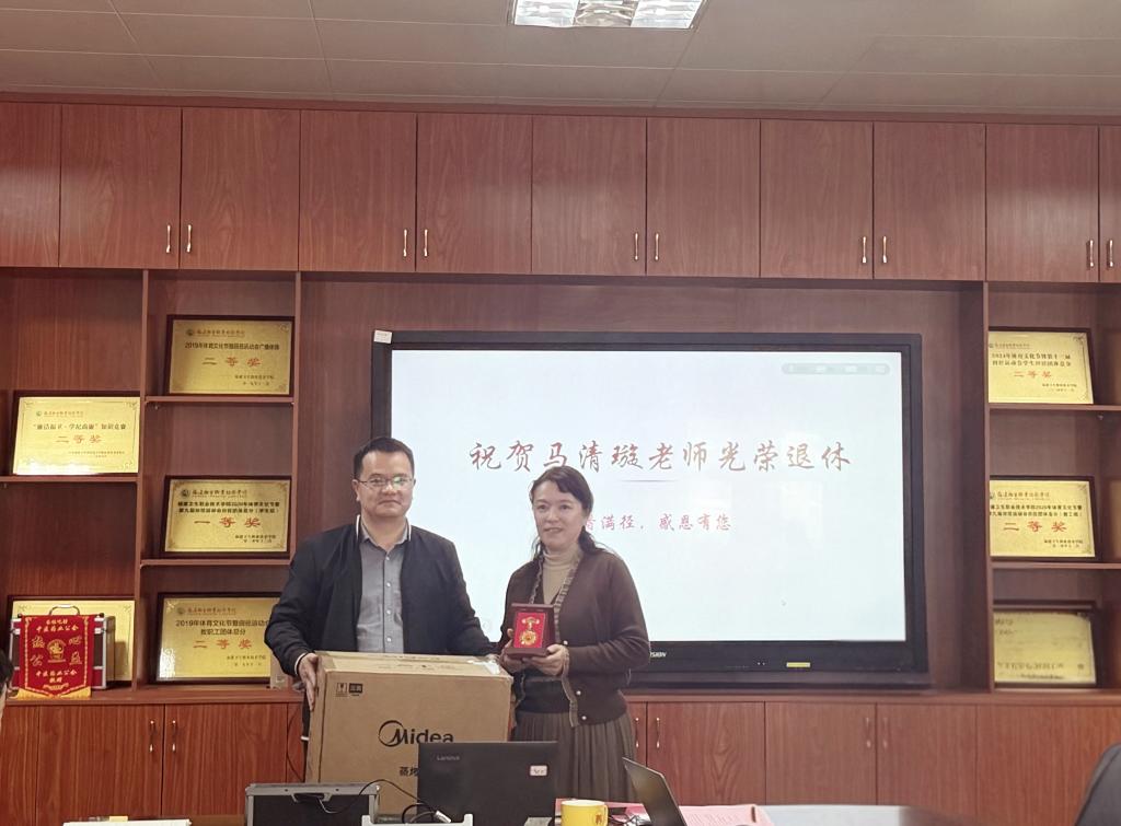 最后学院院长邓元荣代表学院向马清璇老师颁发了退休纪念章并赠送退休纪念品,感谢她多年来为学院教育事业付出的心血与贡献。