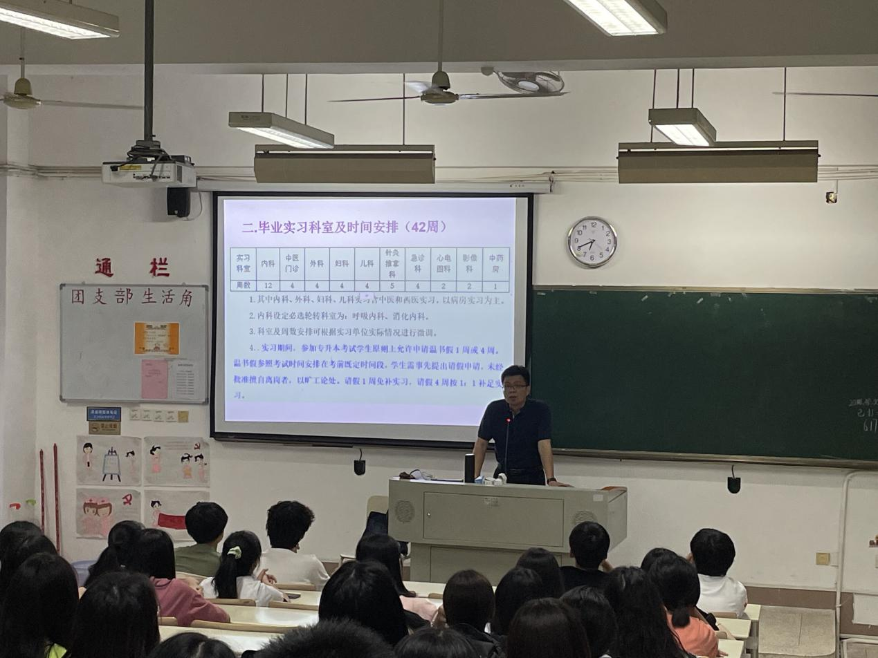 动员大会上,陈洁副书记从纪律管理等方面对同学们提出了要求,强调了实习期间的请假制度、纪律问题、财产安全等,并指导使用实践管理平台进行请假等手续。林国威副主任激励同学们要胸怀大局,提高眼界与格局,不忘初心努力成为你想成为的好医生。陈铭副主任强调实习中要不忘理论学习,理论与实践相结合,为毕业后执业助理医师考试做准备。
