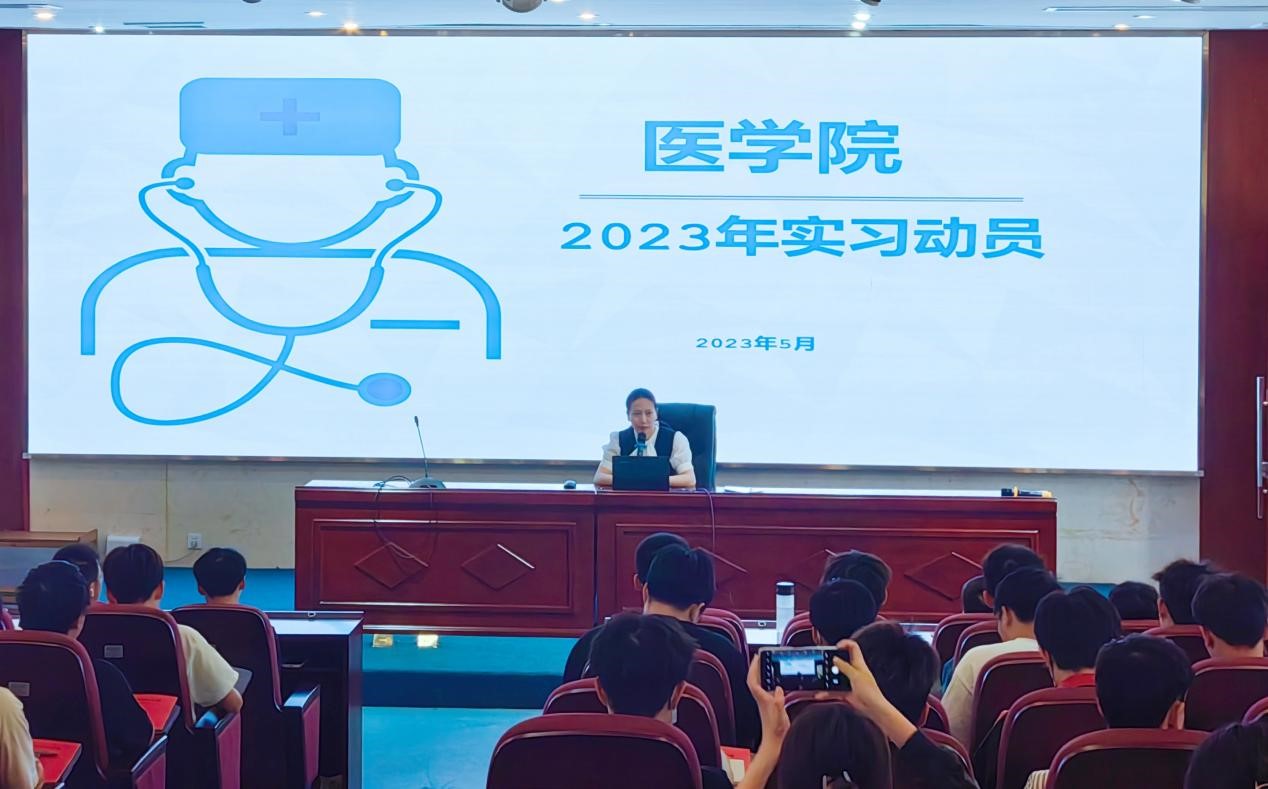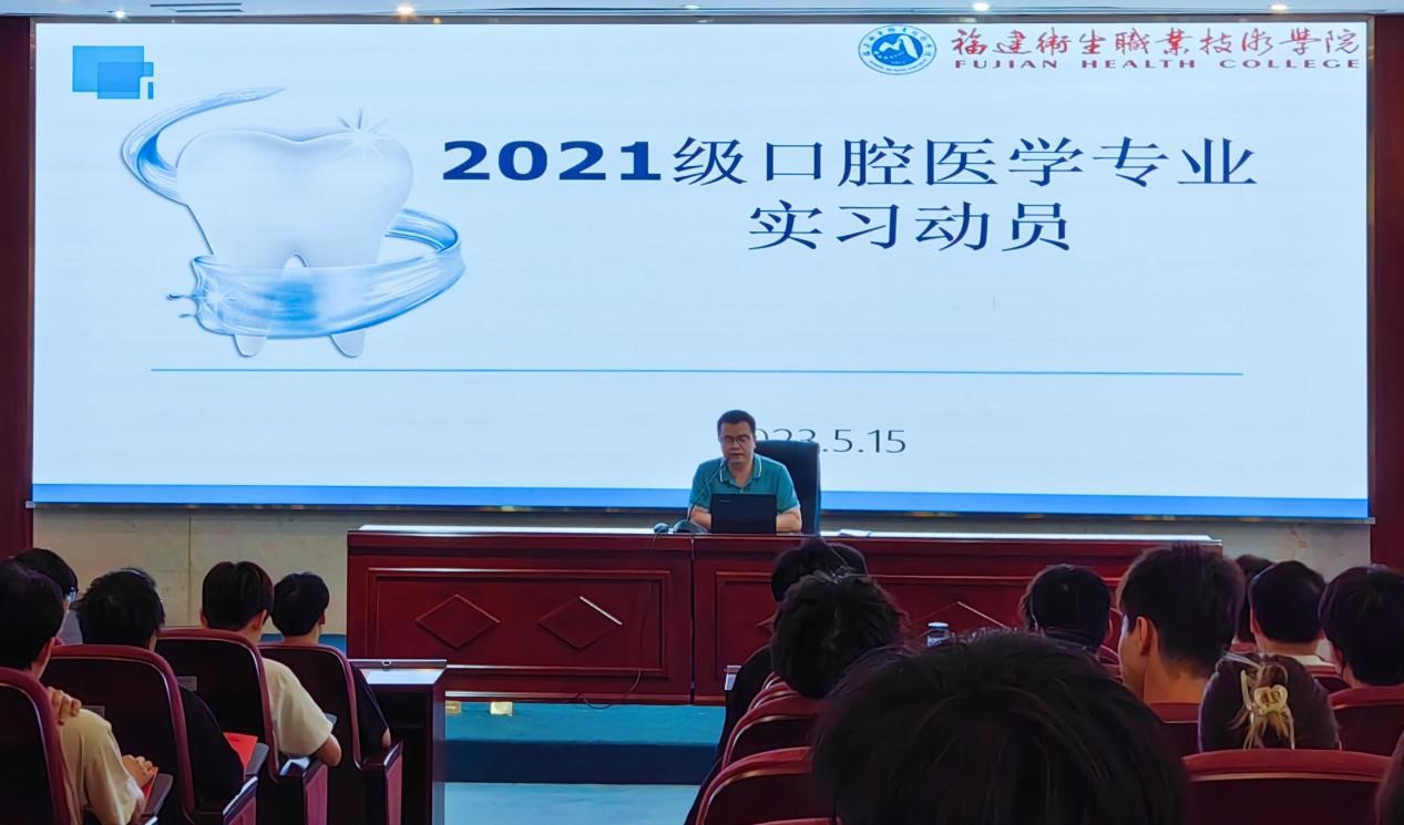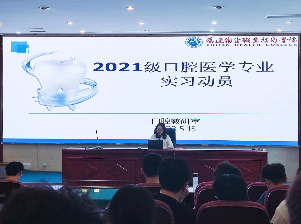 医学院于5月15日在实训楼报告厅开展2021级口腔医学专业学生实习动员大会,医学院副院长邓元荣、党总支副书记陈洁、口腔医学专业教研室主任全程玲、辅导员吴晓欣及21级口腔专业121名学生参加了此次动员大会。