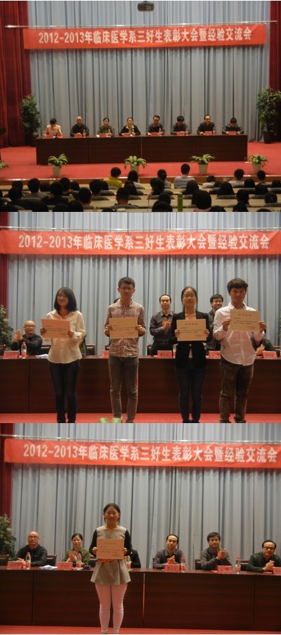 为激励2012-2013学年先进集体及先进个人,“2012-2013学年临床医学系三好生表彰大会暨经验交流会”于 11月 6 日下午在学术厅隆重举行。院学生工作处处长黄铭珊,院团委副书记宋维,临床医学系党总支书记邱滚忠,系主任潘在兴、郑向红,副主任林国威,主任助理林浩,系团总支书记邱萍,全体辅导员,以及2012级、2013级学生代表参加了本次大会。大会由系团总支书记邱萍老师主持。