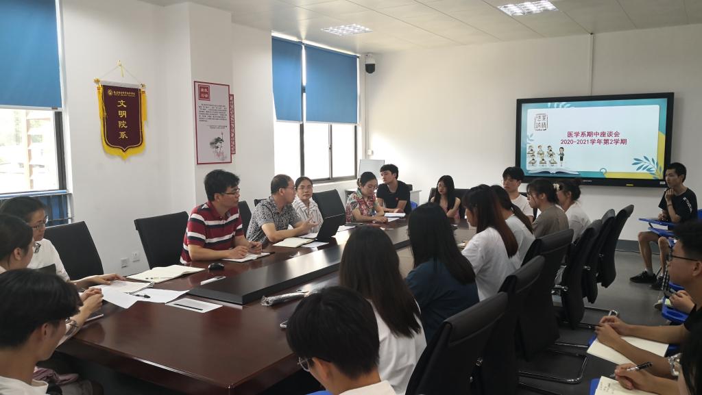 为促进师生的沟通与交流,收集学生在前半学期课堂教学中遇到的问题,医学系于2021年5月27日中午在实训楼311会议室召开期中座谈会。参加此次会议的有学校质量管理办公室主任郭礼坚、副主任王珊珊、校督导李冬秀,医学系副主任陈铭、林浩,系办公室主任刘能英以及医学系19、20级各班学委代表。