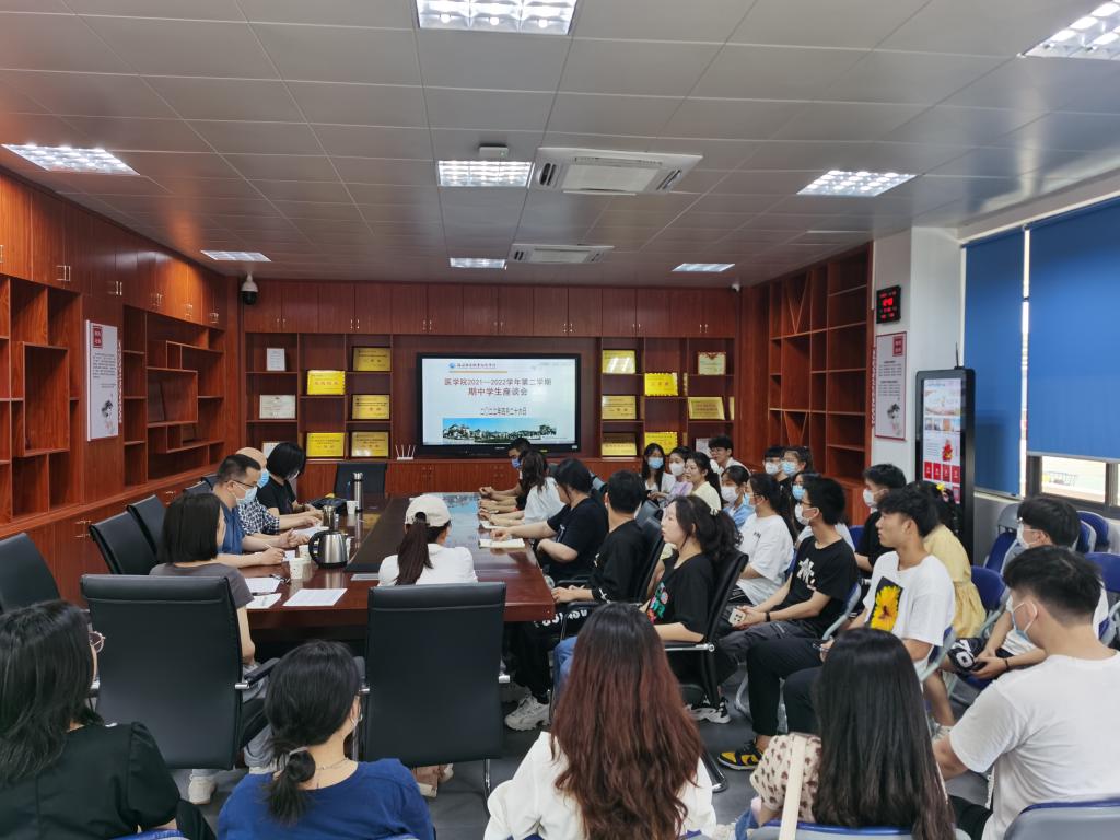 为促进师生的沟通与交流,收集学生在前半学期课堂学习中遇到的问题,医学院于2022年4月26日中午在实训楼311会议室召开期中座谈会。参加此次会议的有学校督导唐荣耀、唐青,医学院副院长(主持工作)邓元荣、副院长兼实训中心主任林国威,副院长兼办公室主任刘能英以及医学院20、21级各班学委代表。