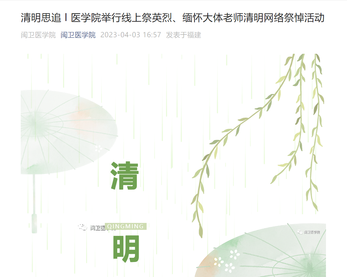 本次清明专题纪念活动前期,医学院教师第二党支部、医学院团总支开展线上祭英烈、缅怀大体老师清明网络祭悼活动,并制作了追思推文,发布于医学院公众号,号召同学们一同学习缅怀。线上线下同步推广,扩大了活动的参与面,让更多的同学一同抚今追昔思奋进。