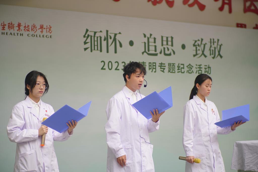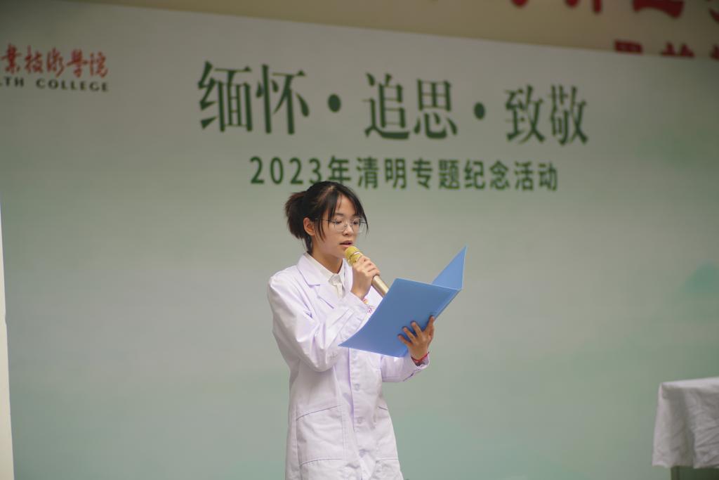 活动现场气氛庄严、肃穆。主持人饱含深情地介绍在传统节日清明节开展追思活动的重要意义,全体师生集体行默哀礼,缅怀先贤。随后,伴着缓缓的轻音乐,散文诗朗诵《缅怀•追思•致敬》唤起大家浓浓的思绪,表达了对无言良师的敬佩与感激。医学院学生代表还分享了《长征中走出的红色军医——徐根竹》的事迹,带领大家在故事中感悟“红医精神”。
