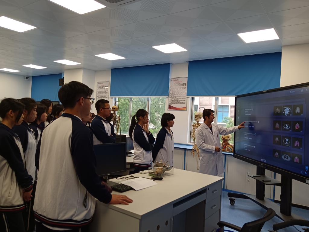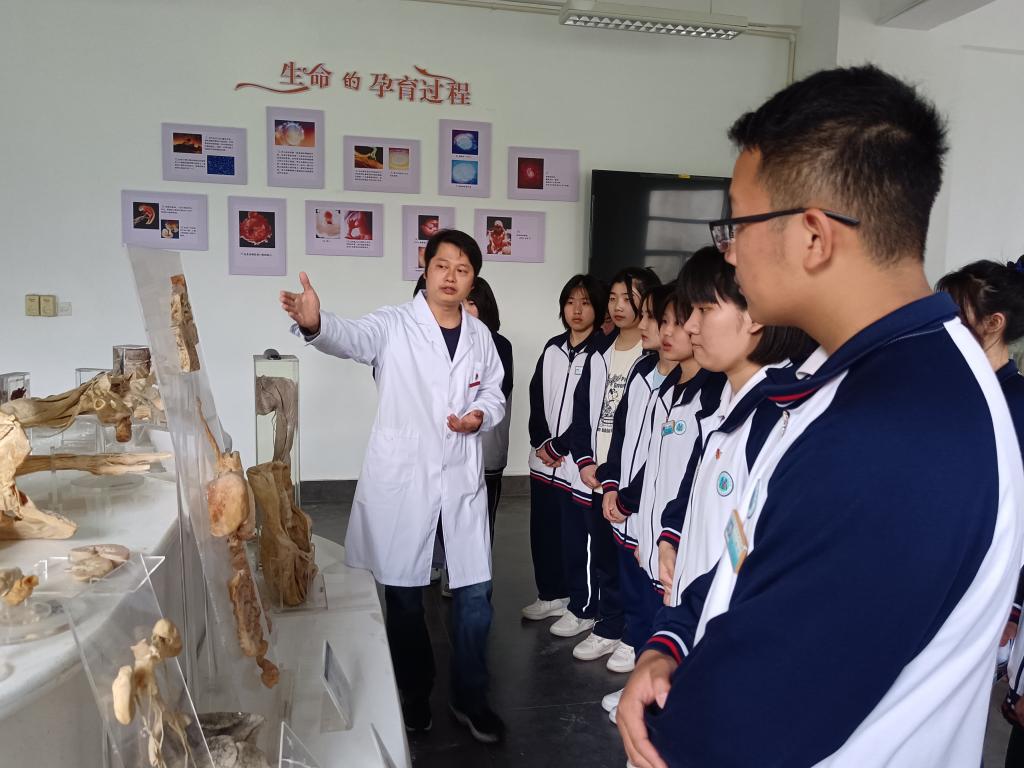 活动后,部分学生及闽侯县职业中专学校师生代表参观了解剖实训室。医学院教师第二党支部支委林加福老师作为志愿者引导讲解形态学馆标本,带学生体验使用示教仪、数字人软件。学生们被多样化的辅助教学信息化技术深深吸引。林加福鼓励闽侯职专学生努力学习,欢迎大家今后报考我校继续学习。