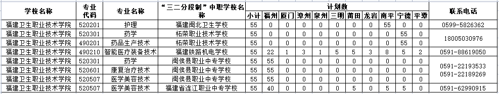 2022我校五年专分别与福建闽北卫生学校、柘荣职业技术学校、福建铁路机电学校、闽侯职业中专学校、连江职业中专学校联合办学,考生在中专校学习生活三年后转入我校,相关招生录取问题咨询,请拨打相应联办校电话。