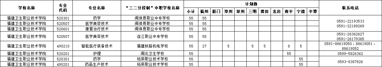 2023年我校五年专分别与福建闽北卫生学校、柘荣职业技术学校、福建铁路机电学校、闽侯职业中专学校、连江职业中专学校联合办学,考生在中专校学习生活三年后转入我校,相关招生录取问题咨询,请拨打相应联办校电话。