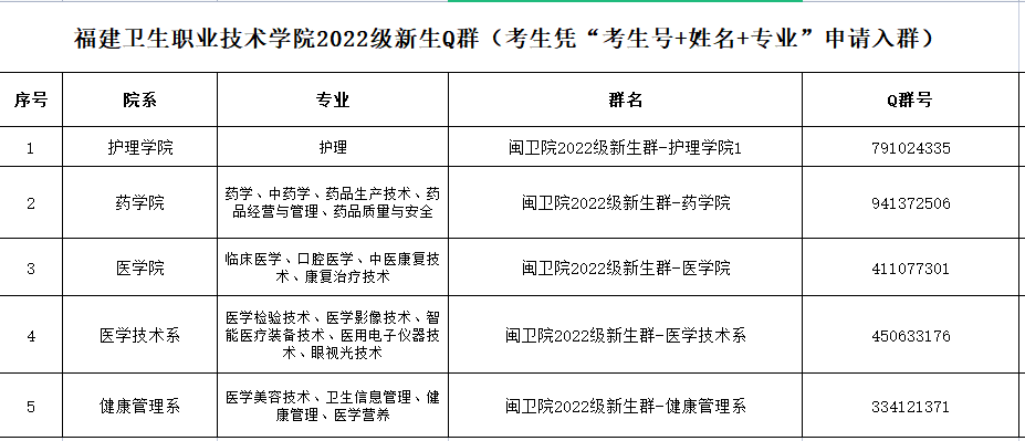 2022年福建卫生职业技术学院新生QQ群一览表